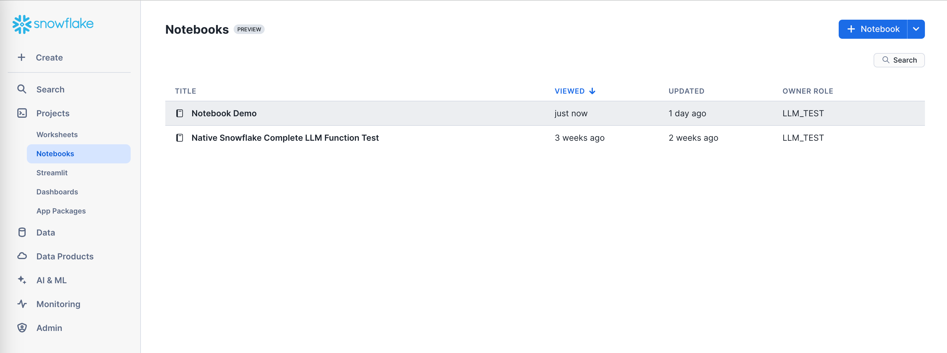 Let’s create a notebook by clicking the “+ Notebook” button. This will create a new laptop, which we will call Notebook Demo. Remember to select your new warehouse.