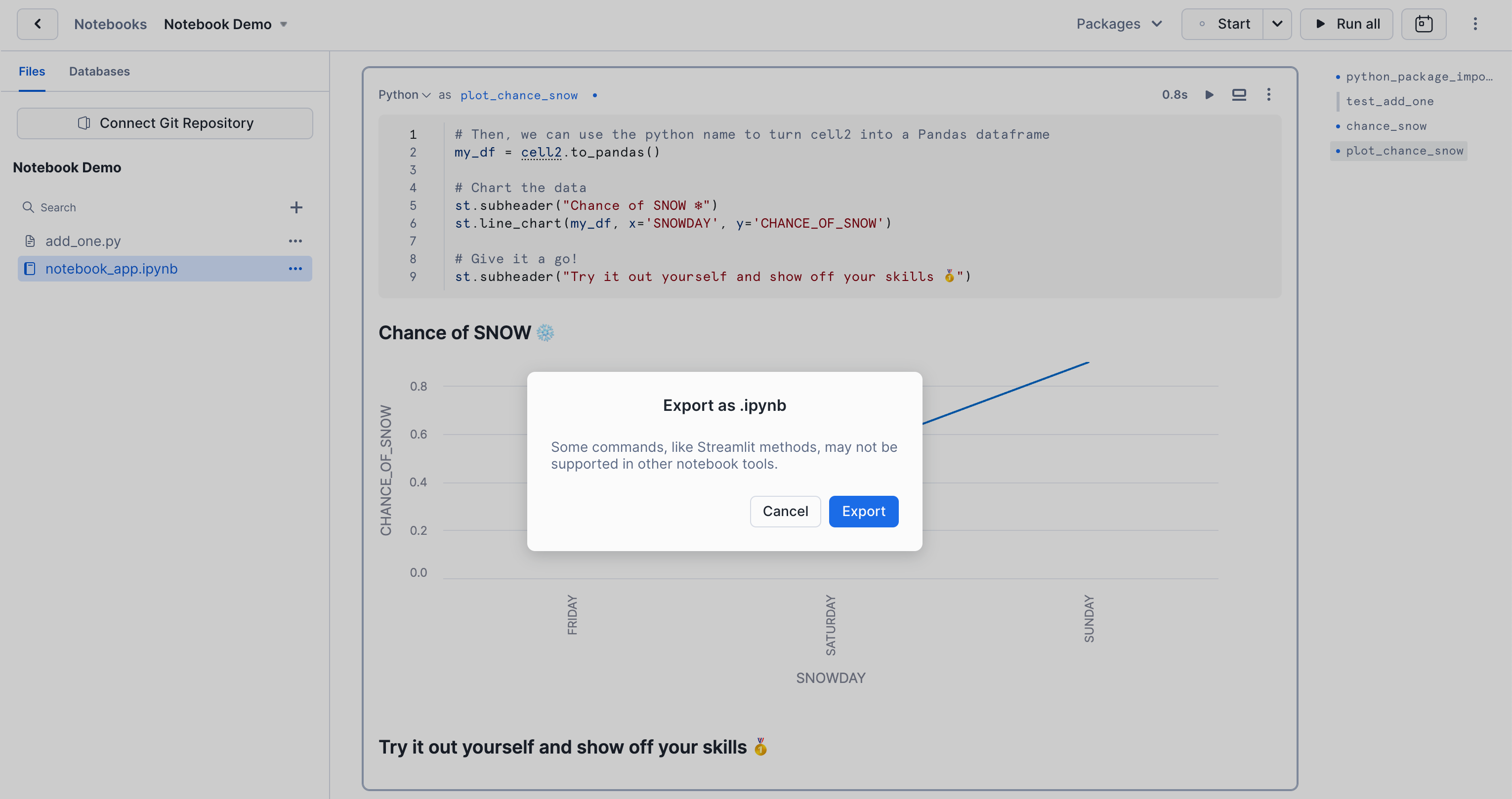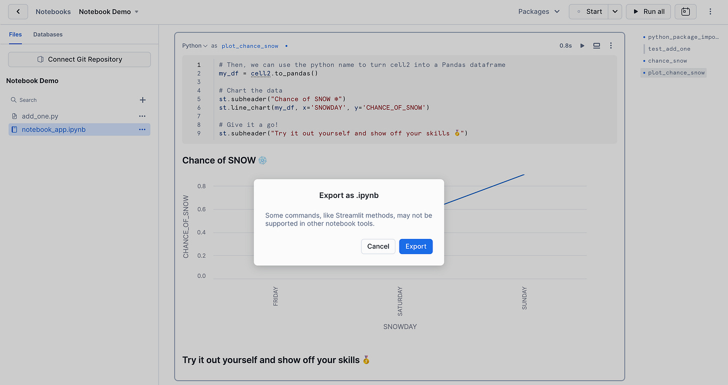 Export your notebook to share your analysis with stakeholders, or share the notebook within Snowflake for seamless team collaboration.